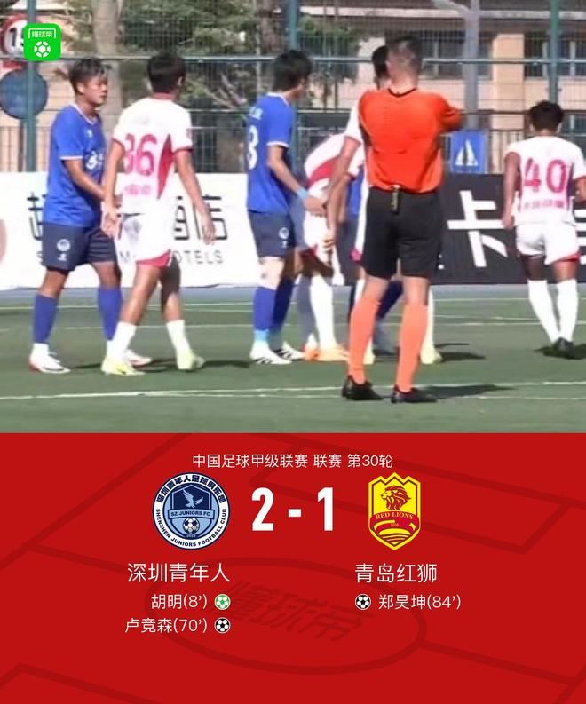 北京时间11月8日,中国足球甲A联赛第30轮,深圳青年主场迎战青岛红狮。深圳小将付明得分,卢靖森得分。青岛红狮队郑浩坤进球。最终比分是深圳青年2-1青岛红狮。重要事件:第8分钟,张义轩送出点球,胡明主罚点球破门,深圳青年1-0青岛红狮。第70分钟,宾吉文右路传中,卢靖森头球破门扩大比分,深青2-0领先。第8号 比赛进行到第4分钟,仇建一获得禁区内任意球。郑浩坤头球破门,扳回一分。青岛红狮1-2。两支球队的球员都参加了比赛。比赛马上就要开始了。第8分钟,张义轩主罚点球,胡明跟进罚球。深圳青年1-0青岛红狮。第26分钟,姚书辰发笔表达不满阿尔蒂踢。裁判向他出示了一张黄牌。第59分钟,一记倒三角传球从左侧底线传到门前。第70分钟,卢凯文的射门击中边网。 ,宾吉文右侧传中,卢靖森头球破门扩大比分,深青将领先优势扩大到2-0。第84分钟,周建一禁区内任意球,郑浩坤头球扳回一分。青岛红狮1-2队阵容技术统计